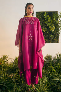 Featuring Nirva Co-ord Set by Shikha Mehta from Baagh Collection. This wine silk chanderi tunic, adorned with intricate thread embroidery, offers a relaxed fit. It pairs perfectly with fuchsia wide-leg pants and a short cotton slip, blending vibrant color with luxurious fabric for a chic, contemporary look.