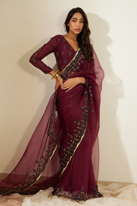 Featuring Purple Poornima Saree With Blouse by Sarang Kaur from Gulaal Collection. This enchanting saree in regal purple features organza silk with a complementing Chanderi silk blouse piece. Ideal for those seeking a blend of traditional craftsmanship and contemporary sophistication in their attire.