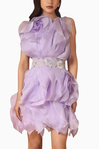 This Shriya Som signature dress is crafted in a luxurious crepe base, featuring organza ruffle details and a distinctive rosette pattern for a standout look. Paired with a stunning embroidered belt, it exudes elegance and sophistication.