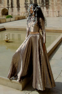 Featuring Purple Tissue Brocade Lehenga Set by Ritika Arya Jain's RAYA collection, redefining Indian occasionwear with modern grace, this regal ensemble pairs a dazzling full-bodied lehenga with a structured blouse and an airy veil, softened by a translucent drape.