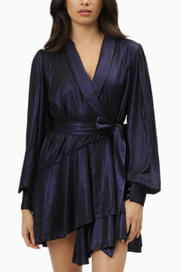 Zina, the wrap dress that belts at the waist and structures the silhouette. Its metallic fabric will not make you go unnoticed.
