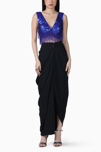 The Puzzle Blouse is that classic sexy blouse you need in your wardrobe. It is hand embroidered with square sequins which is tessellated in different Ways . Designed with a deep V neck and a curved shaped hemline. Closes at the back with hooks with a beautiful tassel detail on the hem , it works as a great option to either wear with your saris or with pants for a cool modern look.