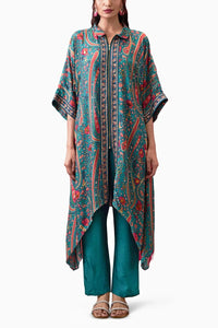 The Teal Green Qala Embellished Asymmetrical Kimono Sleeves Kurta, crafted in Crepe, exudes contemporary elegance. The kurta features striking asymmetrical kimono sleeves, enhanced with delicate embellishments, creating a chic and modern silhouette. Paired with matching pants, this ensemble is perfect for a stylish, refined look at any occasion.