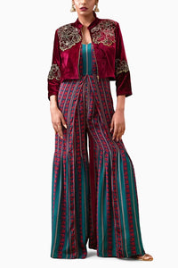 The Teal Green Mehr Printed Paneled Jumpsuit in Crepe offers a sleek and contemporary silhouette with vibrant prints that add a modern flair. Paired with a luxurious Maroon Embroidered Jacket in Velvet, this ensemble combines rich textures and intricate detailing for an elegant, statement-making look. Ideal for formal or festive occasions, it blends bold color with sophisticated craftsmanship.