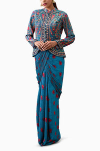 The Teal Green Qala Printed Drape Skirt with Embroidered Jacket in Crepe combines a flowing, printed skirt with a meticulously crafted embroidered jacket. The rich teal hue adds depth and sophistication, while the intricate embroidery on the jacket enhances the overall elegance. This ensemble is perfect for a chic, statement-making look at any festive or formal event.