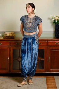 Featuring the Qirat navy blue embroidered velvet boxy choli paired with matching low crotch pants, this elegant set offers a relaxed fit with detailed embroidery. Perfect for stylish festive occasions, it blends modern design with traditional craftsmanship.