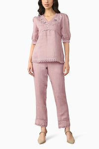 This elegant V-neck top features puffed sleeves with delicate lace cuffs and scalloped lace trim along the hem and neckline, offering a perfect blend of comfort and sophistication. Intricate hand-embroidered cotton vines with subtle golden accents gracefully weave across the fabric, blooming into vibrant crystal dahlia flowers, transferred with heat-pressed craft for a touch of warmth and refined beauty.