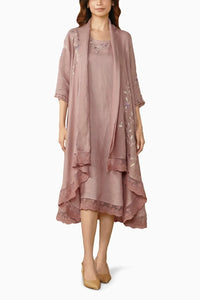 This free-flowing jacket, paired with a fitted dress featuring 3/4th sleeves, is adorned with layers of lace for a relaxed fit that drapes beautifully. The design exudes effortless elegance, enhanced by delicate hand-embroidered cotton vines with subtle golden accents. Blooming into vibrant crystal dahlia flowers, transferred with heat-pressed craft, this ensemble adds a touch of warmth and sophistication, perfect for a polished and graceful look.