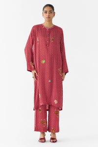 The Quartz Polka Dot Straight Kurta & Pants crafted from our stunning vegan silk fabrication, trans-seasonal, is a statement piece. This set, printed in our jewels polka dot print, is a two piece set. The kurta is a straight fit with high side slits. It has a front opening with Swarovski details and hand embroidered with beads. It is paired with our& matching onyx straight pants with an elasticated back. Wear it with heels for an elegant look.