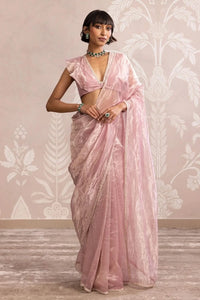 Minimalist and elegant, the Quartz Saree Set pairs a placement-embroidered tissue blouse with a smooth tissue flat saree. Accompanied by a crepe petticoat, this look is perfect for those who appreciate subtle beauty and refined grace in traditional wear.