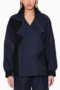 This subtly oversized two-tone denim jacket features engineered seam details, creating a modern, architectural look. The contrasting shades of denim add depth and interest, while the structured seams enhance the jacket’s unique design, making it a stylish and contemporary statement piece.