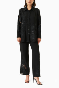 Discover our Black Twill Georgette Coord Set, beautifully enhanced with delicate lace and intricate hand embroidery. Made from luxurious twill georgette, this set offers a flattering fit and a graceful drape. The combination of elegant lace details and artisanal embroidery adds a sophisticated touch, perfect for both casual outings and special occasions. Elevate your style effortlessly with this versatile coord set that exudes timeless charm.