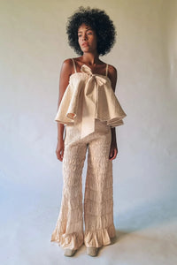 Elevate your style with this luxurious Aged Ivory Quilted Bow Top and White Gold Flared Pants. Crafted from 100% cotton cambric and a metallic illusion cotton blend, this chic ensemble combines elegance and contemporary flair for a standout look.