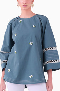 Introducing the Quincy Petrol Cotton Embroidered Top—a stylish A-line piece that effortlessly combines comfort and elegance. This petrol-hued top features stunning 3D flower embroidery in the front and delicate lace insertions on the bell sleeves. With a relaxed fit, it offers ease of movement while adding a touch of sophistication to your wardrobe. Perfect for any occasion, this top is a must-have for those who appreciate unique details!