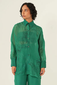 Featuring a sheer jade green shirt in viscose organza, this piece is embroidered with ombré black PVC cord in abstract line patterns. Designed with full sleeves and gathered cuffs, it offers a relaxed silhouette complemented by a front button closure.
