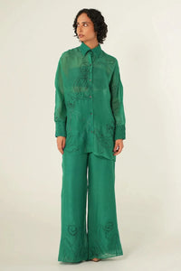 A sheer jade green set in viscose organza, featuring a relaxed-fit shirt with full sleeves, gathered cuffs, and ombré black PVC cord embroidery in abstract line patterns. Paired with high-rise flared pants, detailed with matching linework at the hem and a partially elasticated waistband for effortless movement.