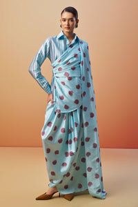 Featuring the Raagya Printed Shirt Saree by Mero's The DOT Light Collection. Crafted in aqua blue printed raw silk, this innovative ensemble combines a printed shirt attached with a dupatta and a draped skirt for a contemporary twist on traditional elegance.