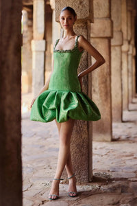 This green mini dress is made from melon crepe and features an avant-garde detailed bottom with a stone-embellished neckline and an attached corset.