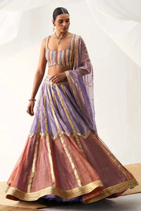Featuring Raat Rani Purple Lehenga Set by ITRH's Sona Chandi Collection, this Set includes a color-blocked blouse with ghunghroo finishings on the edges and a criss-cross string back. Paired with a chevron lehenga featuring geometric lampi gota work and a silk tissue embroidered dupatta, it exudes contemporary elegance with traditional charm.