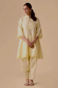 A classic summer cotton kurta set with a twist! Our Rachel salwar suit is intricately adorned shells, ribbon, pearls & crystals embroidery details.