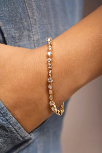 Celebrate brilliance with the Radiant Mixed-Cut Moissanite Bracelet, a dazzling statement of elegance. Featuring an intricate arrangement of round, baguette, pear, and marquise-cut moissanites, each meticulously set in vermeil gold, this bracelet showcases an exquisite interplay of shapes and light. Perfect for occasions that call for a touch of glamour, the mixed-cut design creates a unique rhythm of sparkle and sophistication. A secure clasp ensures a comfortable fit, making this bracelet as functional as it is breathtaking.