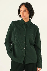 Featuring a forest green shirt with drop shoulders and flared seam detailing radiating from the placket, this piece is accented with transparent PVC loop embroidery highlighting each seam. Full sleeves with tailored cuffs and a front button fastening complete the refined look.