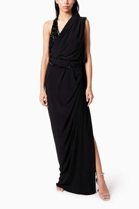 Composition- Silk and Jersey Colour- Black Fit- This sari fits true to size, takes the shape of your body as it is a drape. The sari is high waisted, get it according to your high waist size. The blouse is cut for a slim fit. Customization - There will be an additional 10% charge Size Guide- Measurements in the size guide are ready garment measurements Components- Product code - SVE43182220207&2221603