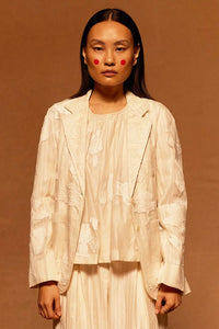 Crafted from lightweight embroidered organza, theRain Organza Blazer is a refined piece that balanceselegance with ease. Featuring patch pockets, a stripedlining, and a classic silhouette, this blazer offers arelaxed yet polished look. Its versatile designeffortlessly transitions between formal and casualoccasions, making it a sophisticated addition to any