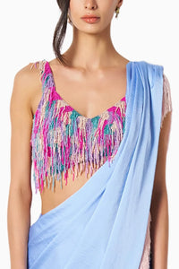 The Bead Fringe Blouse is a fun and stylish addition to your wardrobe. It is carefully hand-embroidered with colorful beads that create an ombre fringe effect. The blouse features a slightly rounded V-neck and a curved hem for a soft, flattering look on the body. It fastens on the side with a concealed zip and pairs perfectly with a sari or a skirt.