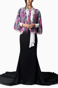 Featuring the Rainbow Beaded Fringe Cape With Anaya Skirt by 431-88, a handcrafted statement piece beautifully embroidered with colorful beads that create vibrant fringes. This cape adds sparkle and drama when worn over saris or draped skirts. Paired with the Anaya Pink Skirt, made from soft, luxurious crepe that drapes elegantly around the body, featuring a long trail at the back and a side zip closure. This co-ord set combines bold artistry with timeless elegance for a stunning, complete look.