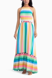 Featuring Rainbow Stripes Halter Maxi Dress by Nikasha from Matchbox Series. Discover elegance in this halter maxi dress with beads and sequins hand embroidered tassel details and tie knot at the back in 100% cotton.