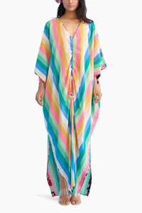 Featuring Rainbow Stripes Kaftan Dress by Nikasha from Matchbox Series. Crafted in 100% cotton, this kaftan dress is adorned with handmade flower tassels.