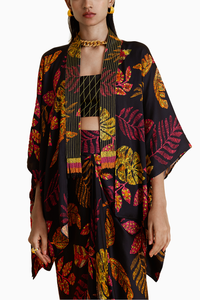 The Rainforest Cape crafted from our stunning Vegan silk fabrication, trans-seasonal, is a statement piece. Made in our hand-drawn Amazon forest inspired Rainforest print, this has Cape has top stitching detailing on the collar. Featuring a front opening, this piece has a relaxed silhouette with hand bead detailing and can be styled in different ways. Paired with matching skirt & blouse. Wear it with heels for an elegant look.