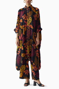 The Rainforest Kimono & Pants Co-ord crafted from our stunning Vegan silk fabrication, trans-seasonal, is a statement piece. Made in our hand-drawn Amazon forest inspired Rainforest print, this has multi-color fringe detailing on the placket. Featuring a front opening, this piece has a relaxed silhouette and can be styled in different ways. Paired with matching trousers with a side zipper. Wear it with heels for an elegant look.