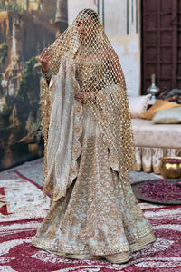 Featuring an Ivory baraat embroidered organza lehenga paired with a signature deep U-neck mirror fringe corset, and an ivory organza dupatta and gotta mirror jaal veil.