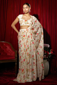 Composition: Chinon Color: Embroidery: Crystal Work Blouse With Tassels Fit: True To Size Model Height: 5' 5 and is wearing Size “S”. (Designed for a contoured fit at the bust, snatched look at the waist & a straight cut pants under.) Components: 2 (Blouse & Sari) Product Code: SVEBRINN15BS25