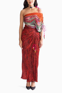 Featuring Raleigh Red Dress by Saaksha & Kinni from Botanica Collection. A dual wave and daisy print sleeveless maxi dress accentuating a kaftan-style drop shoulder with an adjustable tie-up, combining vibrant patterns with a relaxed, customizable fit for a chic and flowing look.