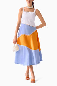 The Ralph cotton color block midi dress in white, sunset orange, and blue features scallop lace details and a back elasticated design with strap adjusters for a customizable fit. The A-line silhouette with wave-like color blocking creates a flattering fit-and-flare shape, blending comfort and style effortlessly.