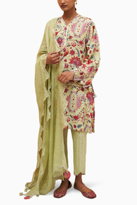 Featuting printed tunic on gold zari booti cotton with tassel detailing, paired with gold zari striped pants with scallop embroidery and a tissue chanderi embroidred dupatta.