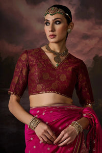 Featuring Rana Wine Blouse by Swatti Kapoor's Firdaus collection, this handwoven Muga silk brocade blouse is lined with 100% cotton and adorned with fine hand embroidery and tassel details crafted from upcycled katran fabric, blending tradition with sustainability.