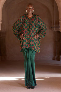 Crystal-embellished dark green and red checkered pattern tunic with embellished tie-up detail at the neck, paired with a green satin draped skirt.