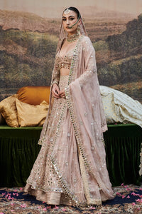 Pink organza lehenga with intricate embroidery and thin gota work on border , is paired with a organza blouse with delicate mirror tassels and tissue dupatta.