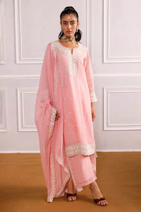 Featuring premium Cotton Chanderi for a lightweight, elegant feel, this ensemble is adorned with intricate dori work and delicate embroidery on the kurta, dupatta corners, and pant sides. The sweetheart neckline adds a graceful, feminine touch, while 3/4th sleeves are subtly finished with embroidery on the cuffs. Paired with a complementing dupatta and straight pants featuring embroidered accents, this look offers a refined and timeless appeal.