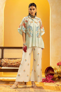 Featuring a blue Rangtara embellished shirt, paired with printed straight pants in chanderi. A refined ensemble balancing intricate detailing with elegant ease.