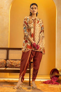 Featuring a beige Rangtara embellished kurta with gathered sleeves, paired with dhoti-style pants in cotton silk. A graceful blend of classic craftsmanship and contemporary comfort.