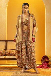 Featuring a beige Rangtara embellished bustier and layered pants, paired with a front tie-up cape in organza. A contemporary ensemble that blends structured elegance with flowing grace.