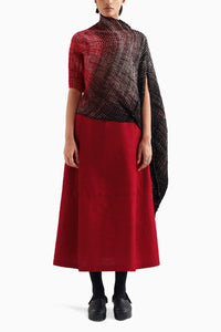 Experience the fusion of artistry and elegance with our handwoven silk shirt showcasing a vibrant interplay of red and black color. This striking piece features a high-contrast color block detail on the neckline, enhanced by a dramatic hand-stitched gota fringe that adds a touch of opulent texture. The meticulous craftsmanship and luxurious silk fabric ensure both comfort and a refined silhouette, making it perfect for making a bold fashion statement. Perfect for adding a pop of color and sophistication to your wardrobe, this shirt merges traditional craftsmanship with modern style for a truly memorable look.