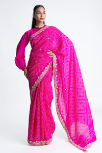 This is a rani Bandhani on silk saree that comes embellished with a french knot work border featuring colourful floral motifs. It comes clubbed with a silk Bandhani blouse piece with hand embroidered borders for sleeves, also in rani.