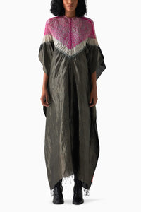 Featuring a free size metallic silk kaftan with our signature shibori triangle neckline.