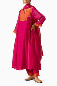 Introducing our handwoven chanderi gather kurta set, featuring exquisite mukesh and gotta detailing on the yoke, complemented by elegant gathers on the sides. This stunning ensemble is paired with our signature handwoven chanderi dupatta, showcasing beautiful zari weaving along the edges. The look is completed with cotton pants adorned with mukesh detailing on the hemline. Perfect for festive occasions, this set beautifully blends traditional craftsmanship with contemporary elegance!